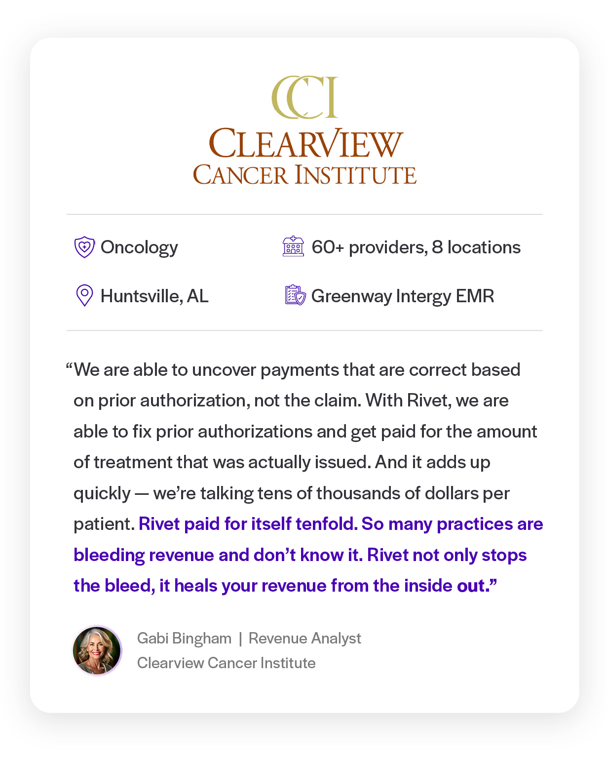 Rivet levels the "paying field" for oncology practices looking to collect more – faster — and more accurately from patients and payers. With Rivet as your oncology revenue cycle sidekick, you can: